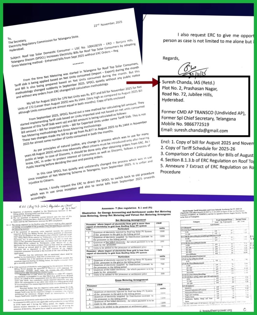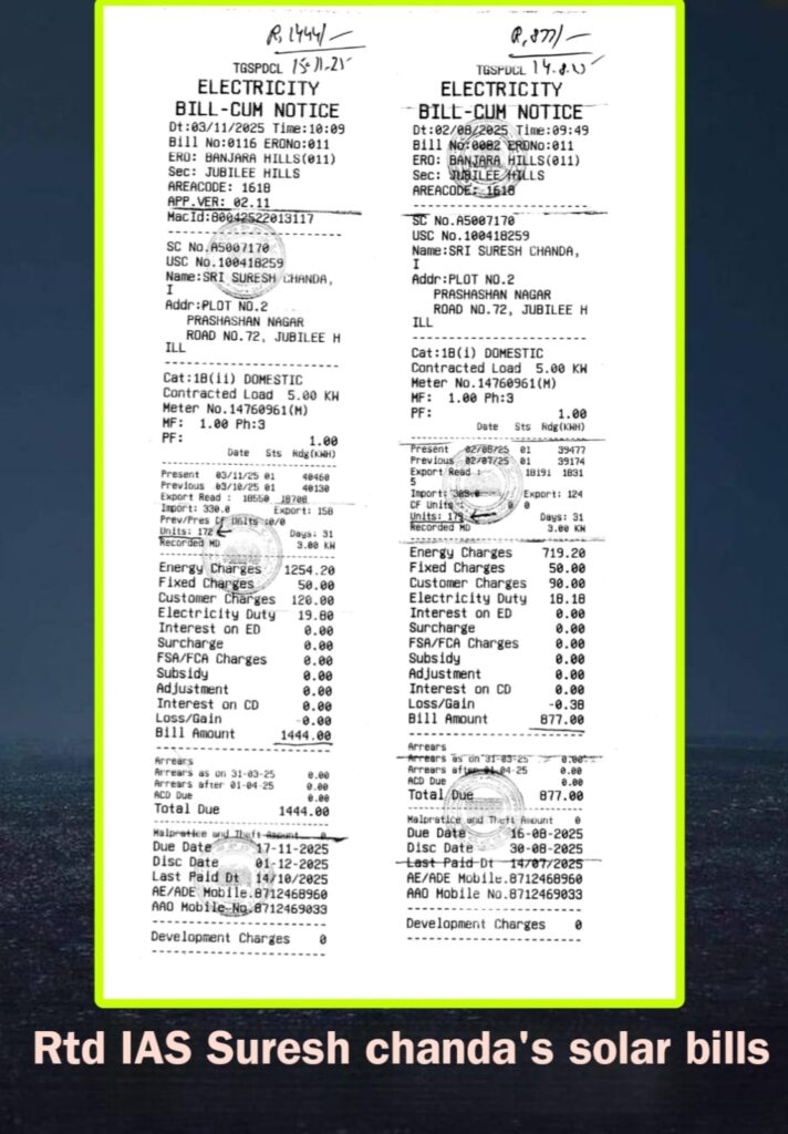 Former CMD of AP Transco and retired IAS officer Suresh Chanda has raised a formal objection before the Telangana Electricity Regulatory Commission. In his letter, he stated that his bill from Rs. 877 for August to Rs. 1,444 for November despite a similar number of units being consumed. He described the shift in billing methodology as unilateral and contrary to the existing regulatory framework.